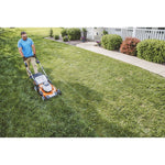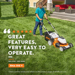 Just the squeeze of a lever engages the RMA 510 V battery-powered lawn mower’s efficiency-driven performance, helping reduce fatigue commonly caused by traditional push mowers. A 21-inch Steel Mowing Deck with a 20-inch cutting width makes the RMA 510 V highly maneuverable and able to quickly cover small-to-medium size yards. The mower’s self-propel function features a variable-speed setting control, allowing choices of mowing speeds between 0.6 mph and 2.8 mph. With the 36-volt STIHL® AP 300 S battery, the RMA 510 V can mow up to 3,078 square feet On A Single Charge™.* With battery, enjoy instant starting, low noise, zero gasoline costs, and zero exhaust emissions. For added convenience and customization, the deck of the RMA 510 V is adjustable to seven different cutting heights, and the handlebar adjusts to three height positions. Durable, ten-inch rear wheels and eight-inch front Ball Bearing Wheels allow for mowing over rough terrain.