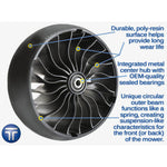 No Compromise The MICHELIN X TWEEL airless radial tire has a consistent hub height which helps ensure the mower deck produces an even cut. The full-width poly-resin spokes provide excellent lateral stability for outstanding side hill performance, while the unique design of the spokes helps dampen the ride for enhanced operator comfort, even when navigating over curbs and other bumps. High performance compounds and an efficient contact patch are designed to provide a long wear life that is two to three times that of a pneumatic tire at equal tread depth.